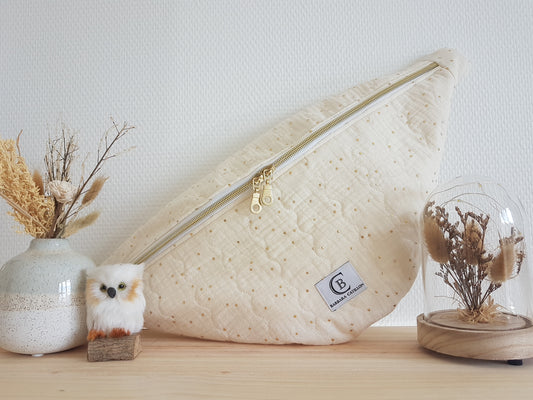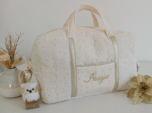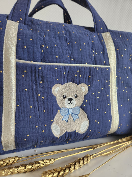 Sac à langer ou de voyage matelassé, double gaze de coton à pois dorés et ourson brodé