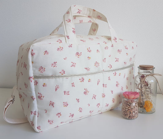 Sac à langer ou de voyage, écru et bouquets de fleurs vieux rose