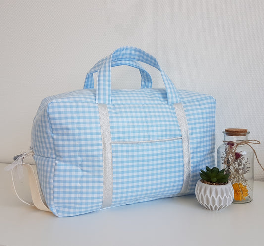 Sac à langer ou de voyage, coton vichy bleu pâle.