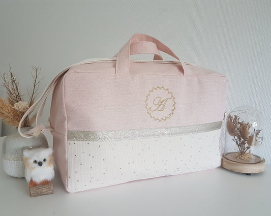 Sac à langer ou de voyage, rose pâle scintillant et double gaze de coton écrue à pois dorés