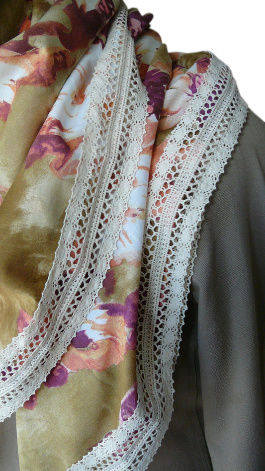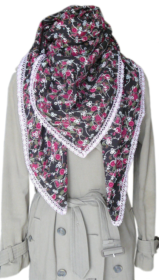 Großer quadratischer Damenschal aus rosa/lila geblümtem Baumwoll-Voile