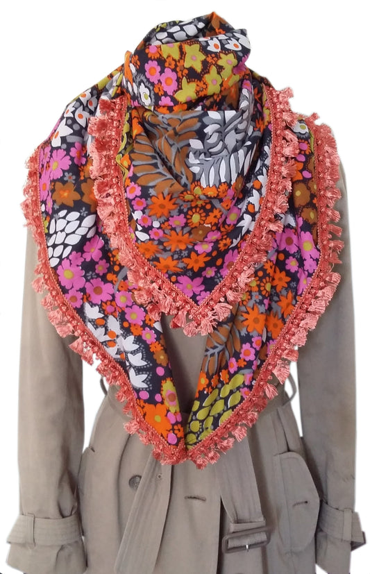 Großer quadratischer Schal für Damen aus geblümter Baumwolle in Korallenrot