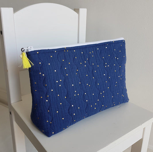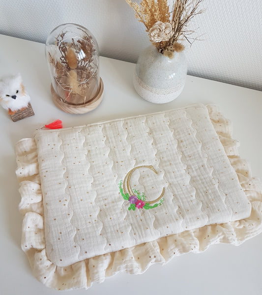 Gerüschte Tablet- oder Computerhülle, Baumwollgaze mit goldenen Punkten.