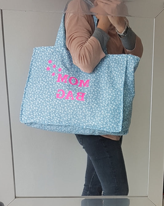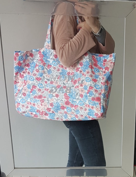 Große blau-weiß geblümte Baumwoll-Schultertasche