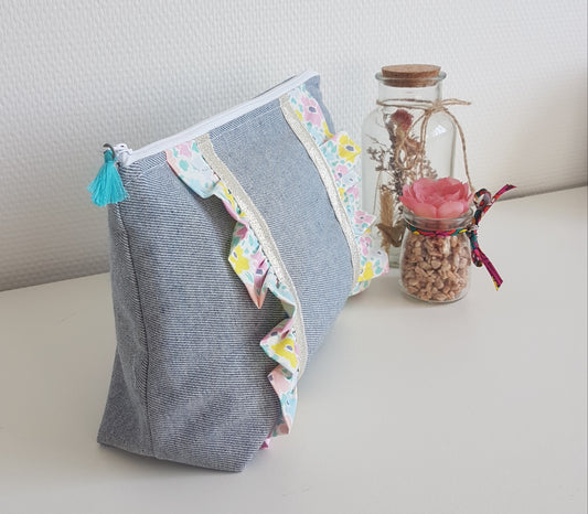 Großes Etui/Federmäppchen aus Denim mit pastellfarbenen Liberty-Rüschen
