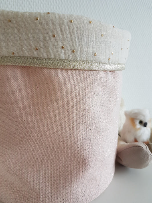 Großer Aufbewahrungskorb/Korb aus schimmernder rosa Baumwolle und ecrufarbener Baumwollgaze.