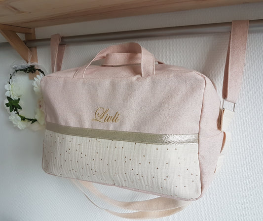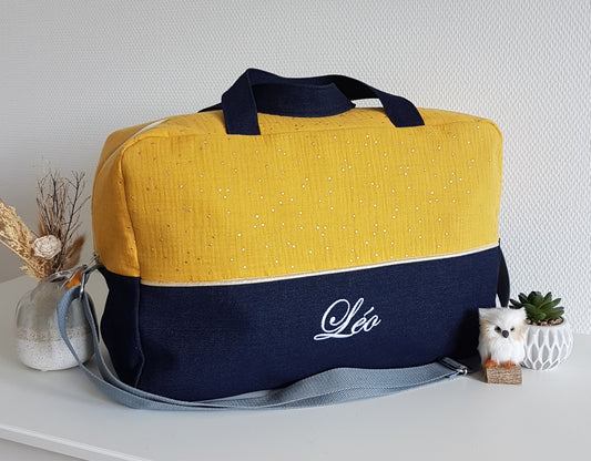 Zweifarbige Wickel- oder Reisetasche, doppelte Baumwollgaze und dunkelblaue Jeans