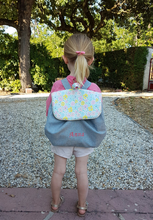 Kinderrucksack aus Denim und fluoreszierendem Pastell in Liberty-Optik