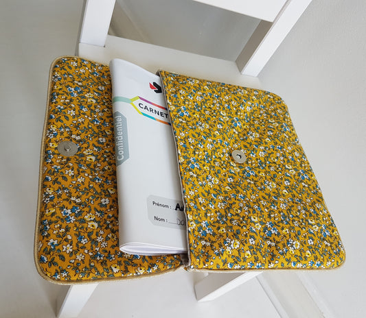 Hülle für Krankenaktenheft, Wickeltasche, aus senfgelber Liberty-Baumwolle.