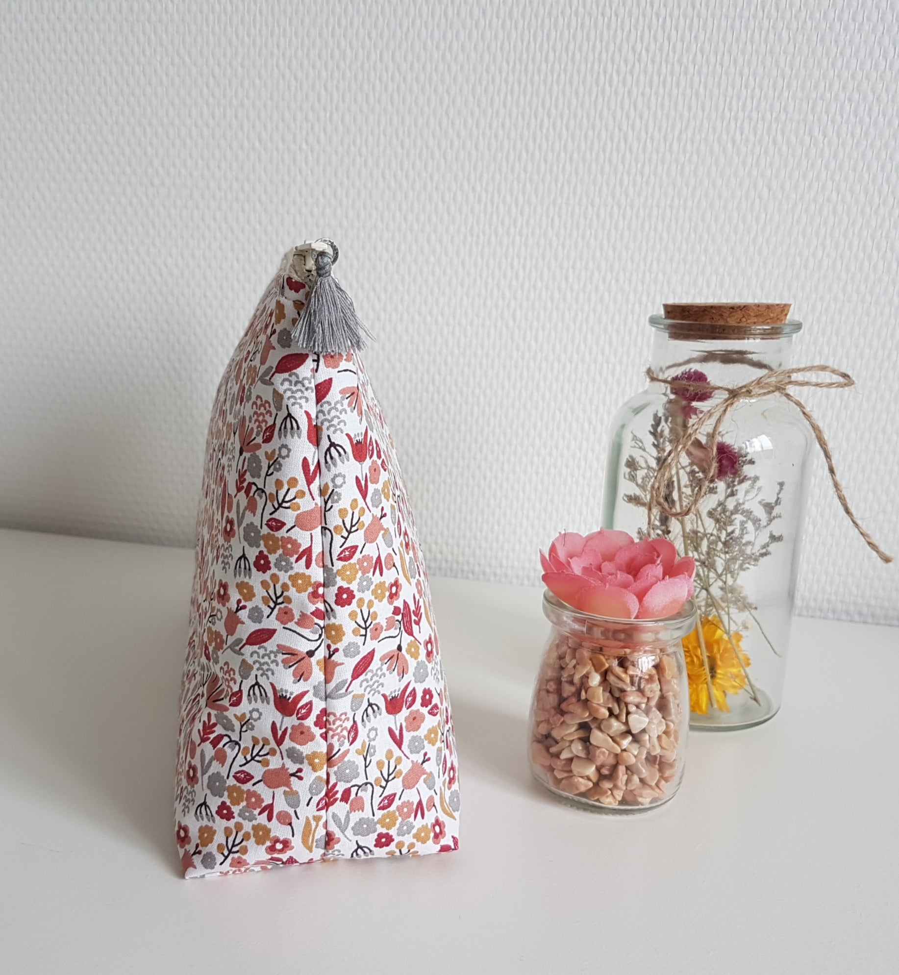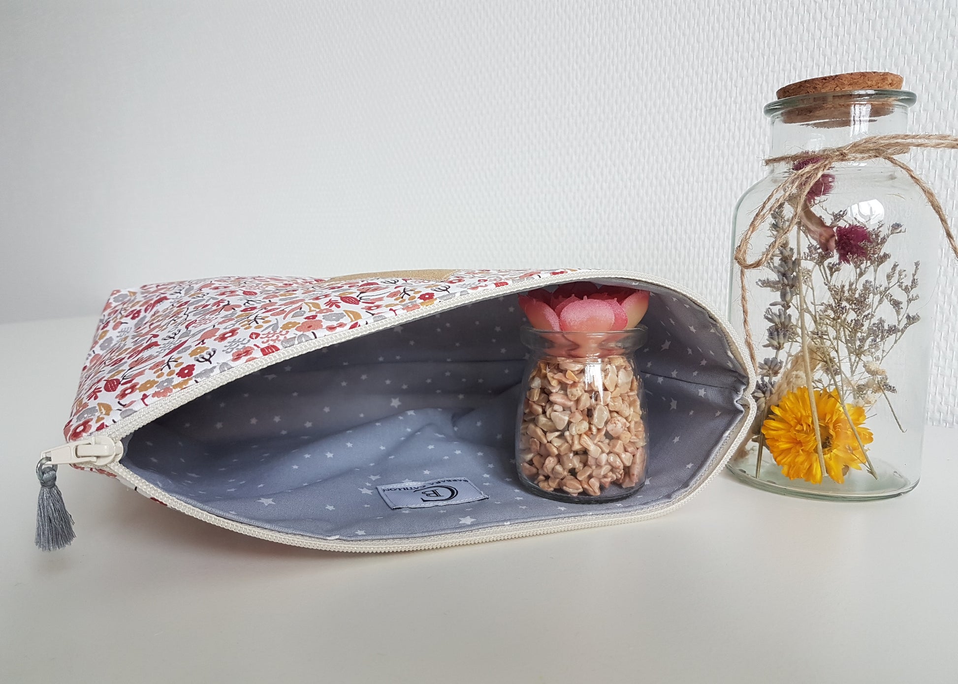 Außenseite aus geblümter Baumwolle im Liberty-Stil in Burgunderrot, Grau und Senfgelb.