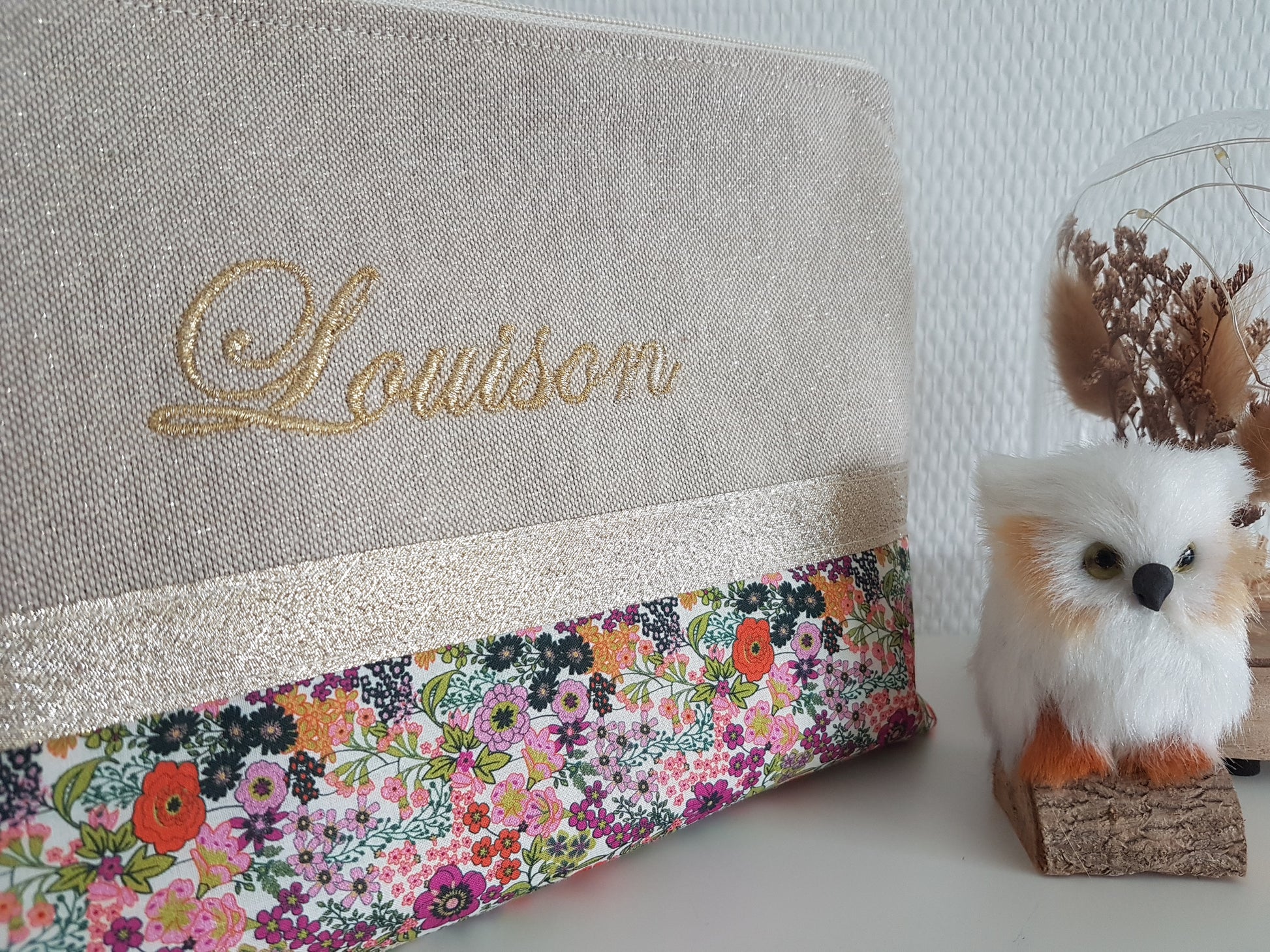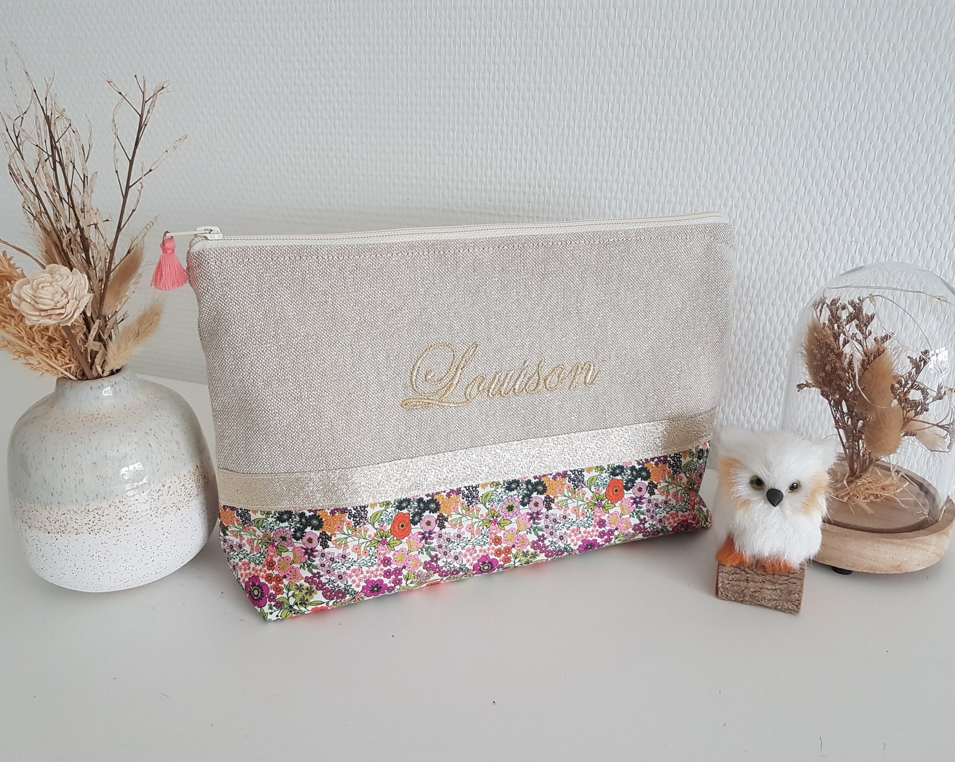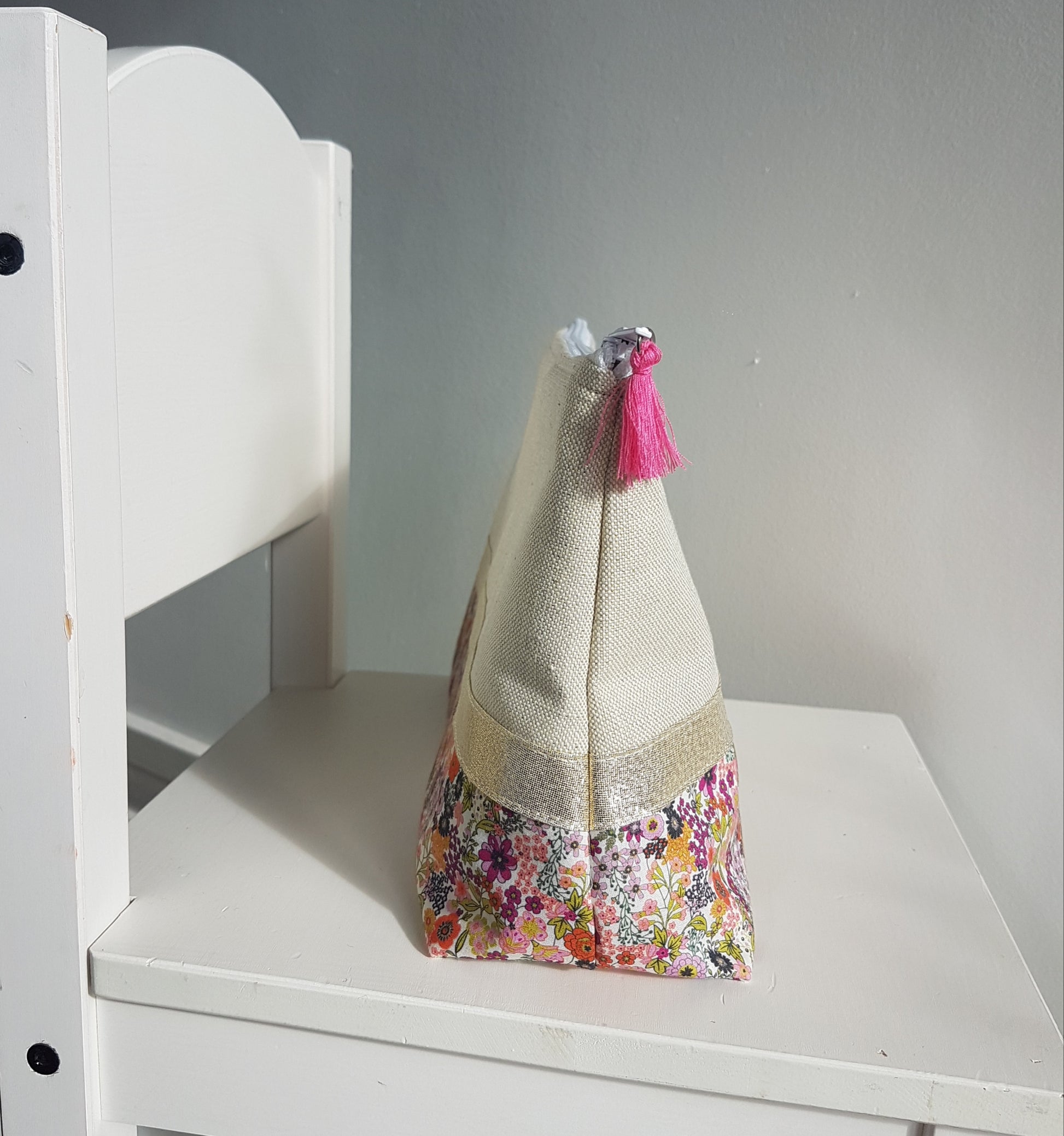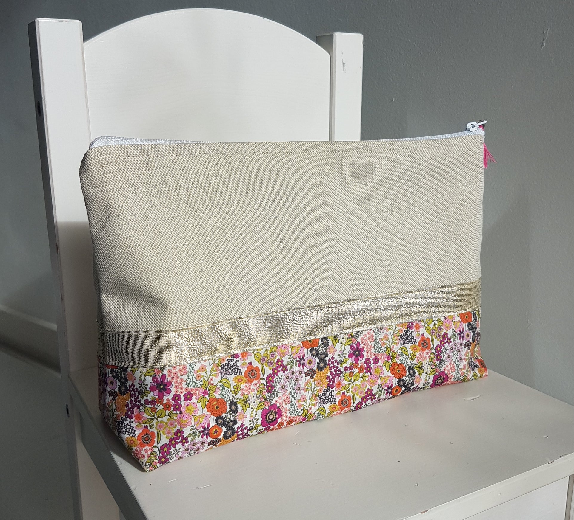 Außenseite aus beiger Baumwolle mit Einlagen aus goldenen Lurexfäden und geblümter Baumwolle im Liberty-Stil in Rosa, Orange, Grün und Lila.