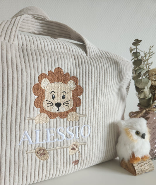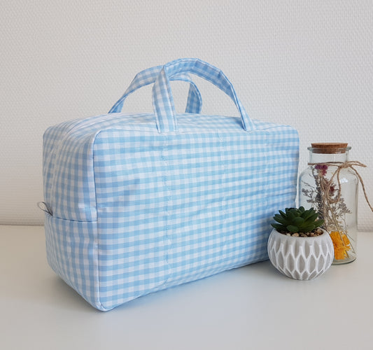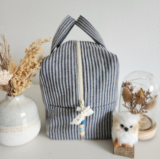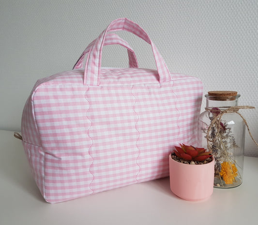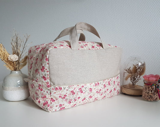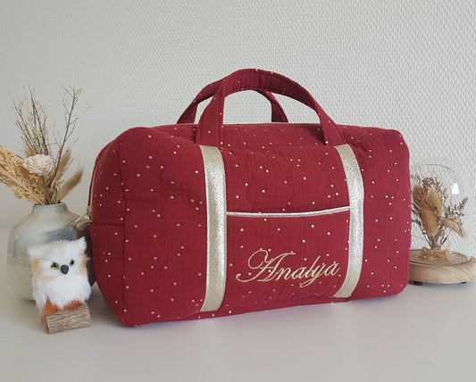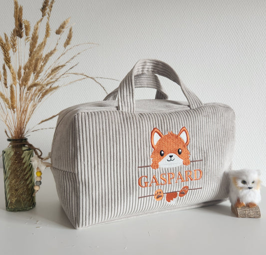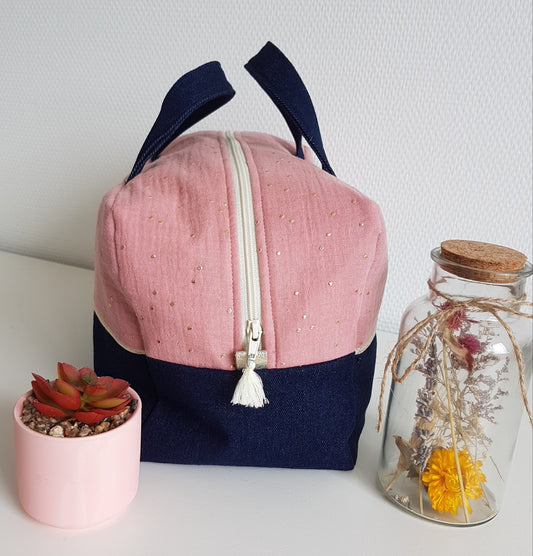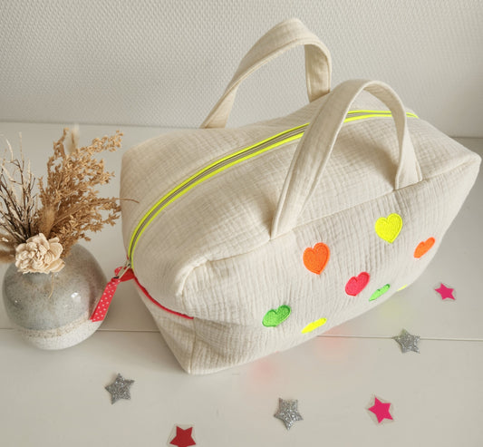Valisette brodée en gaze de coton écrue et petits coeurs fluo