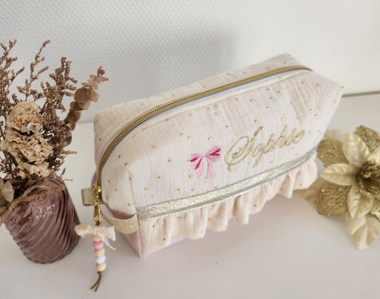Shimmering pink and ecru cotton gauze toiletry bag