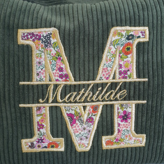 Corduroy toiletry bag, initial embroidery in floral fabric