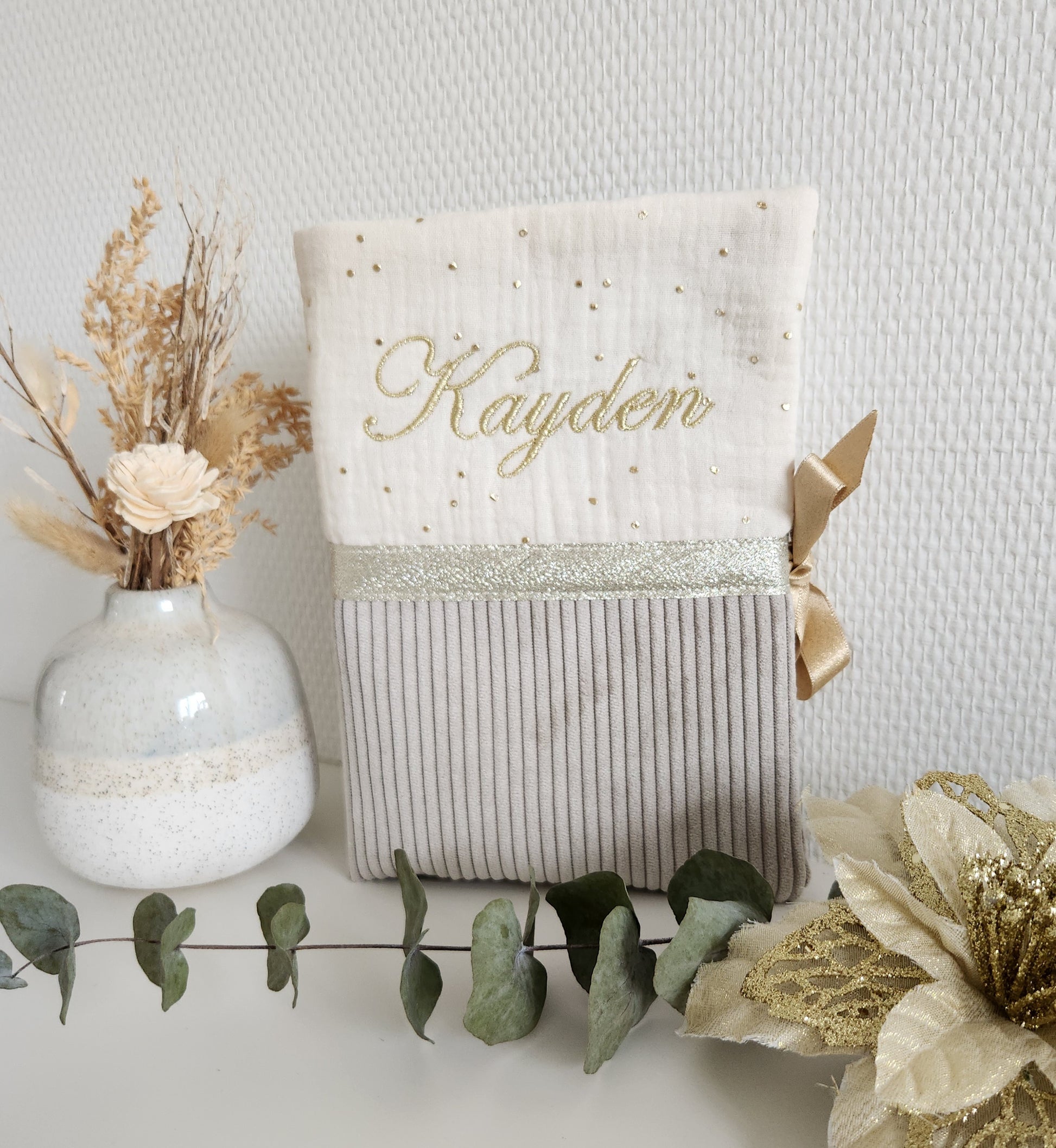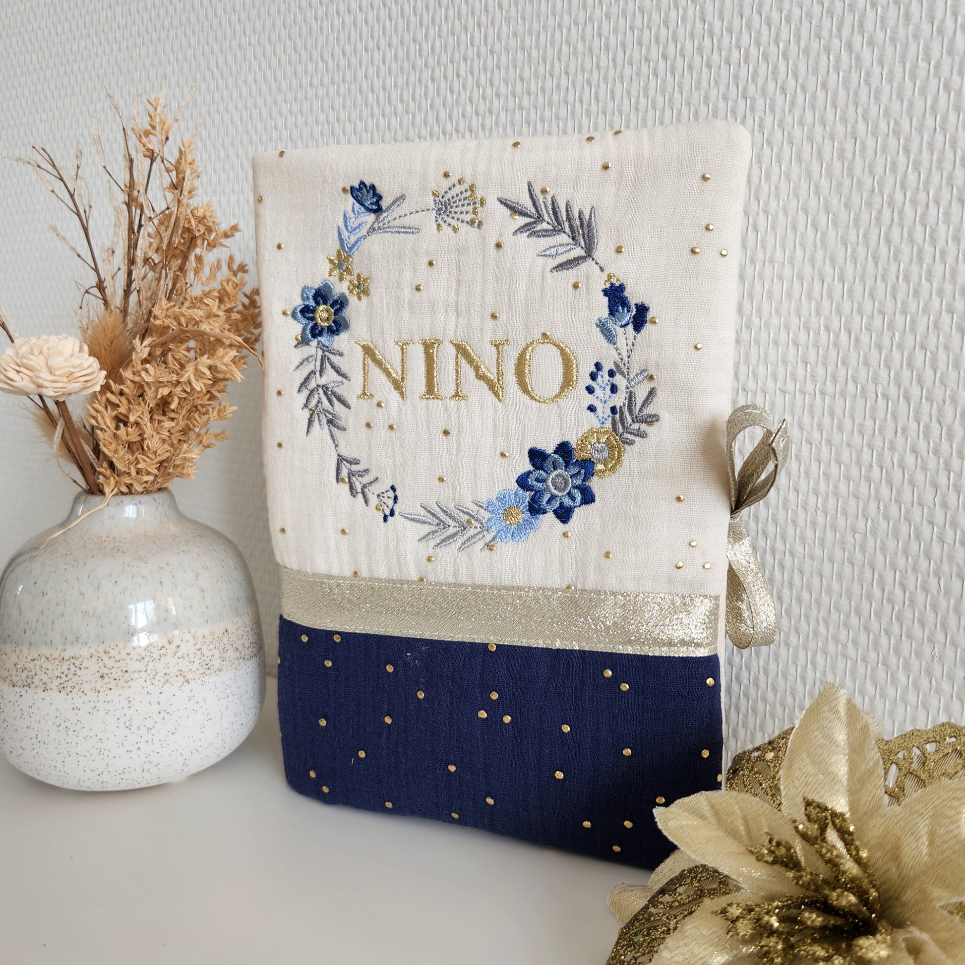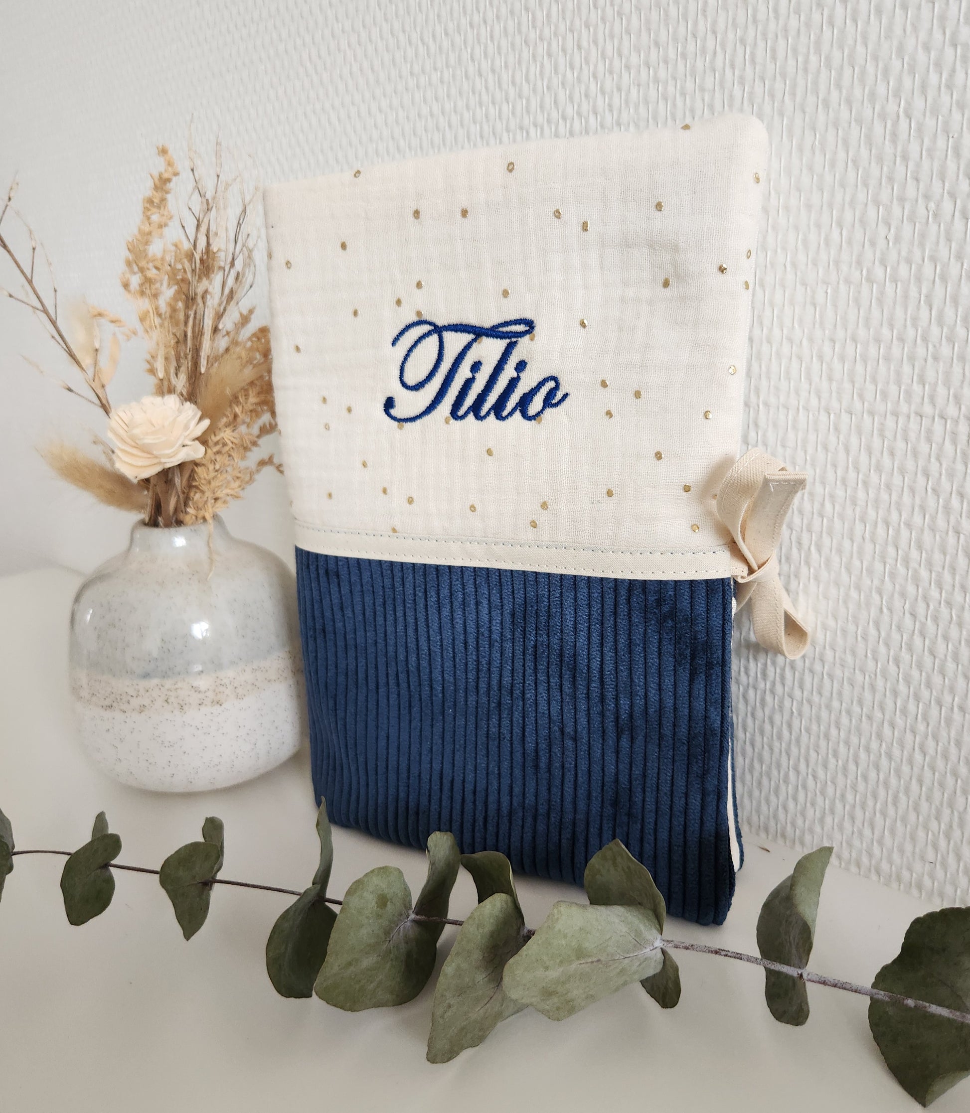 Protège carnet de santé bicolore personnalisable. Un accessoire indispensable au trousseau de bébé! Vous pouvez le personnaliser (tissus et broderie) pour l'assortir au sac à langer et autres accessoires.