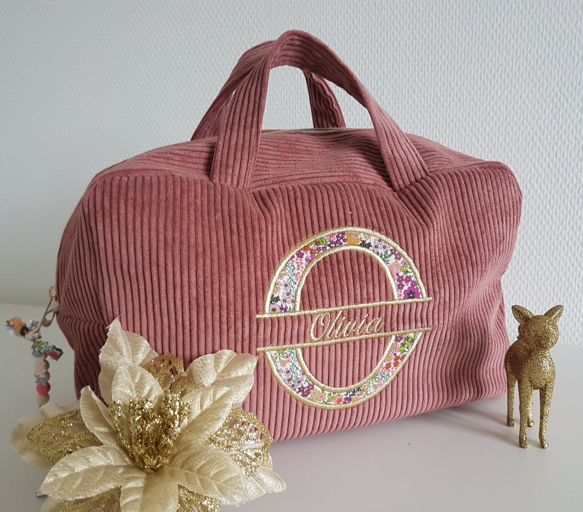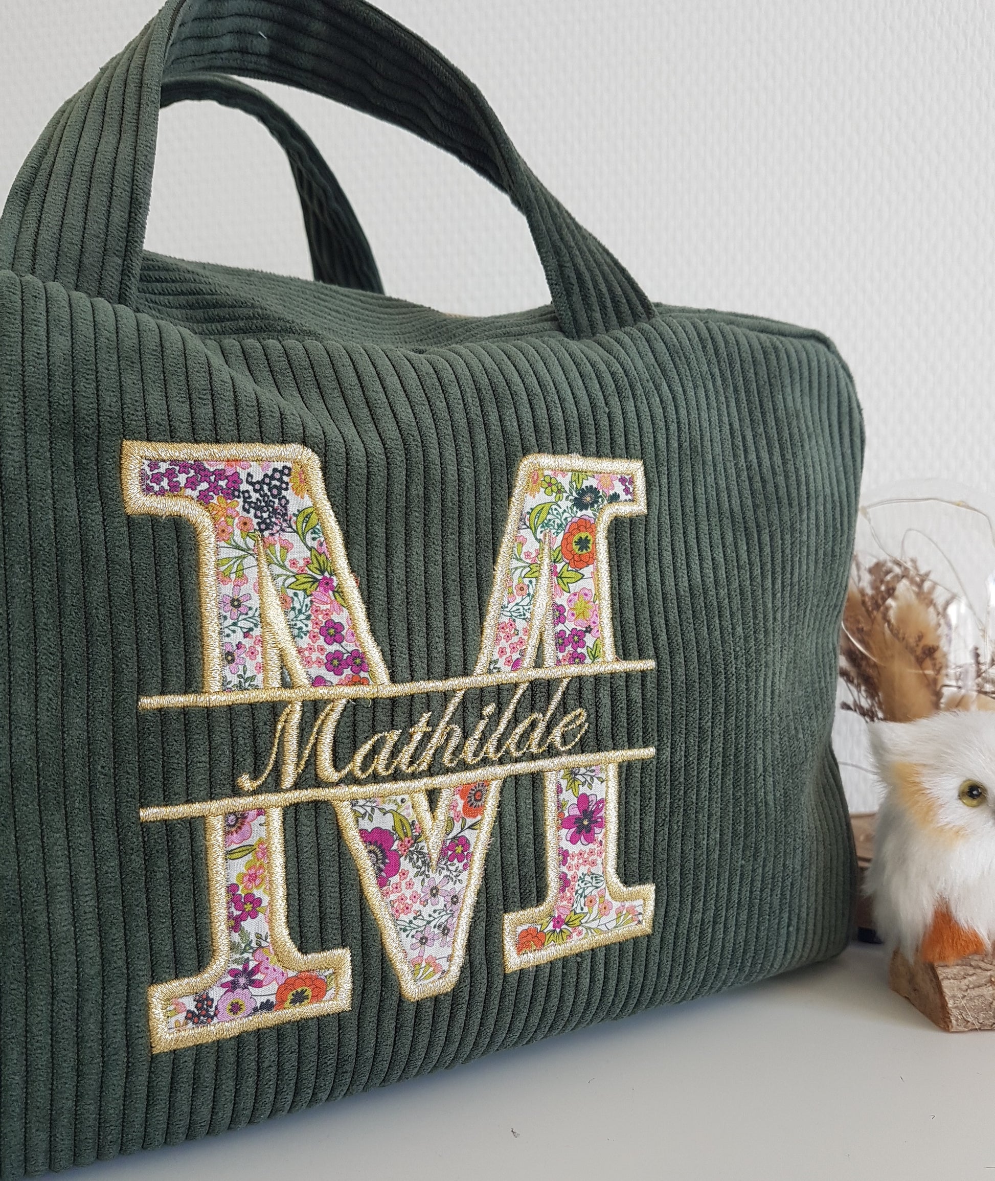 Floral capital letter motif (1st letter of the first name) + first name embroidered in gold on the front.