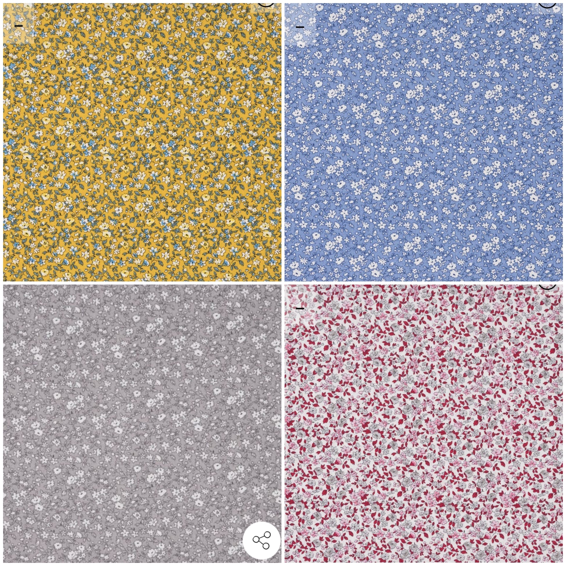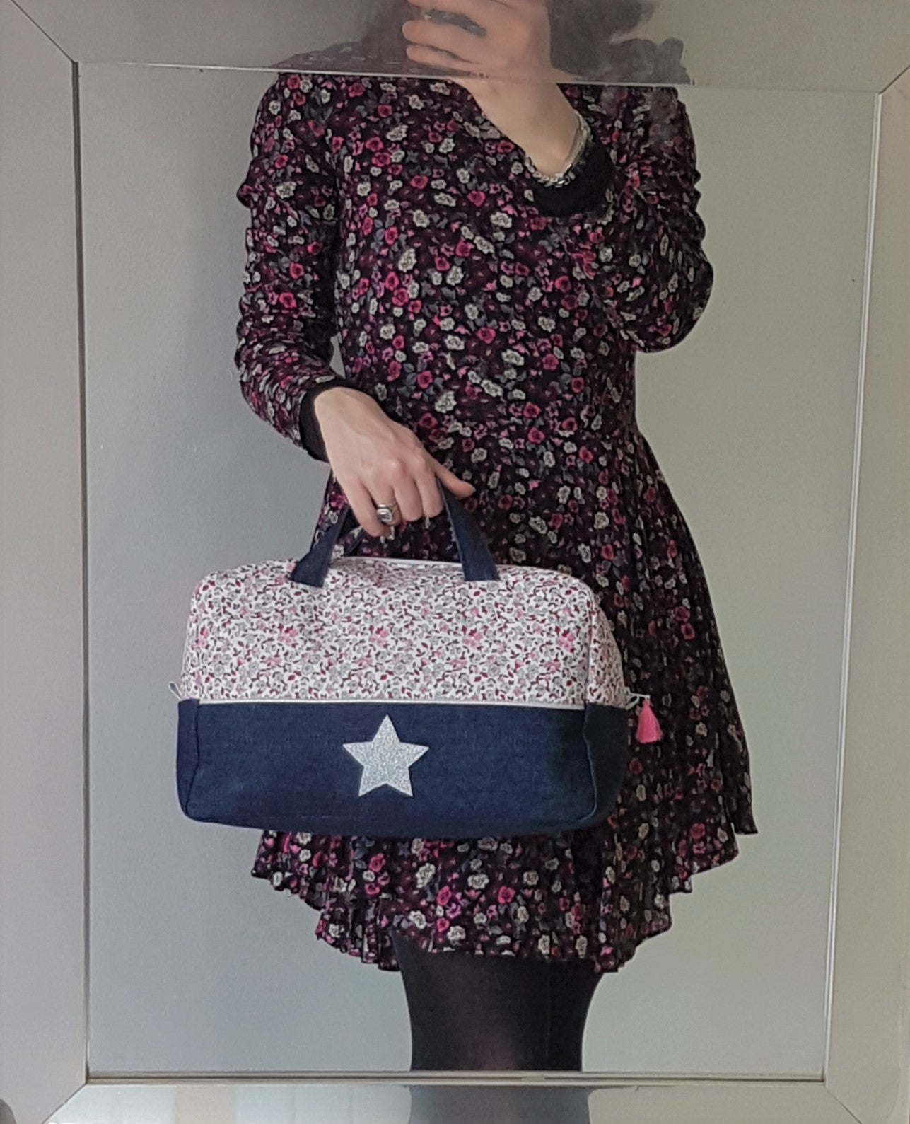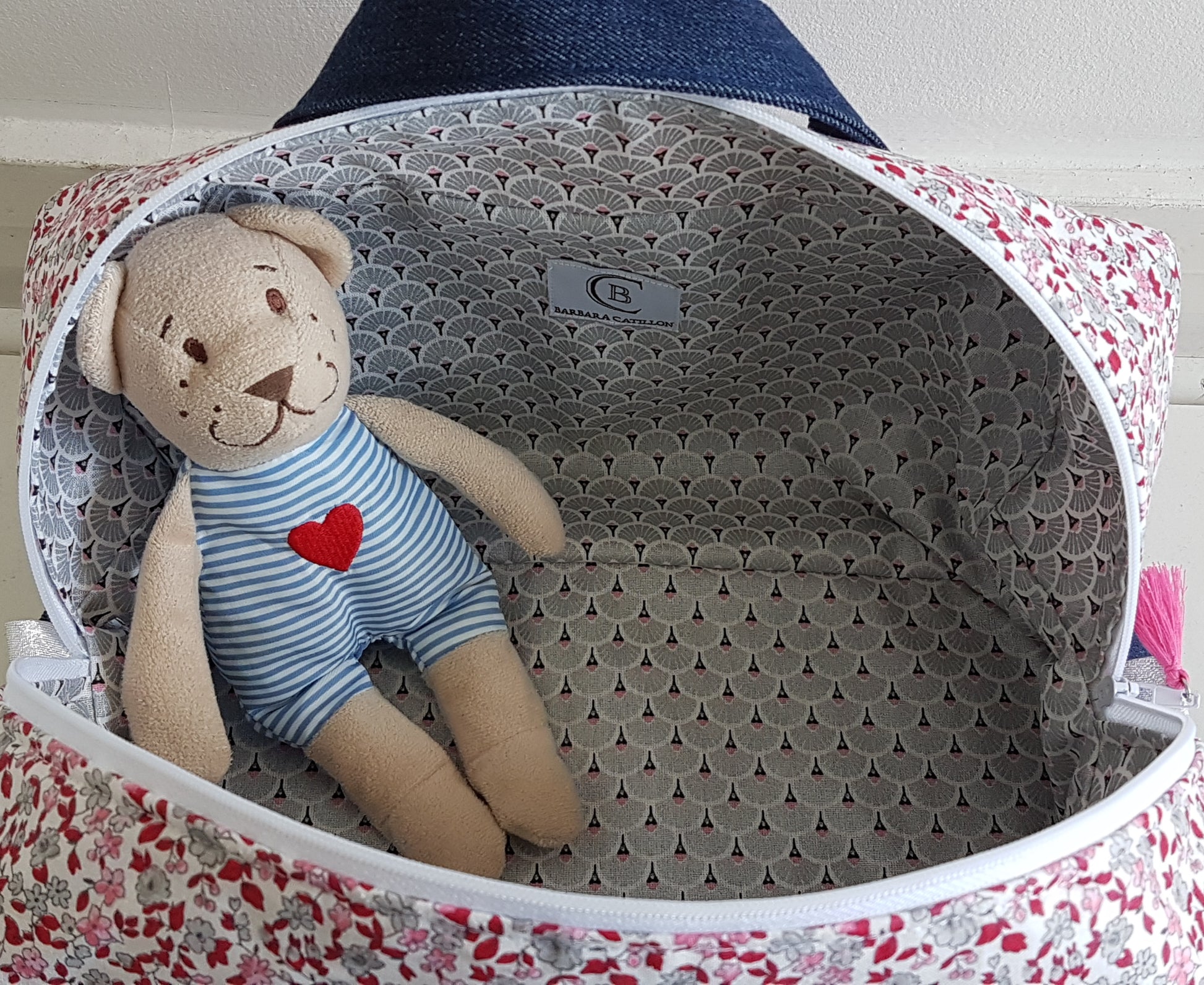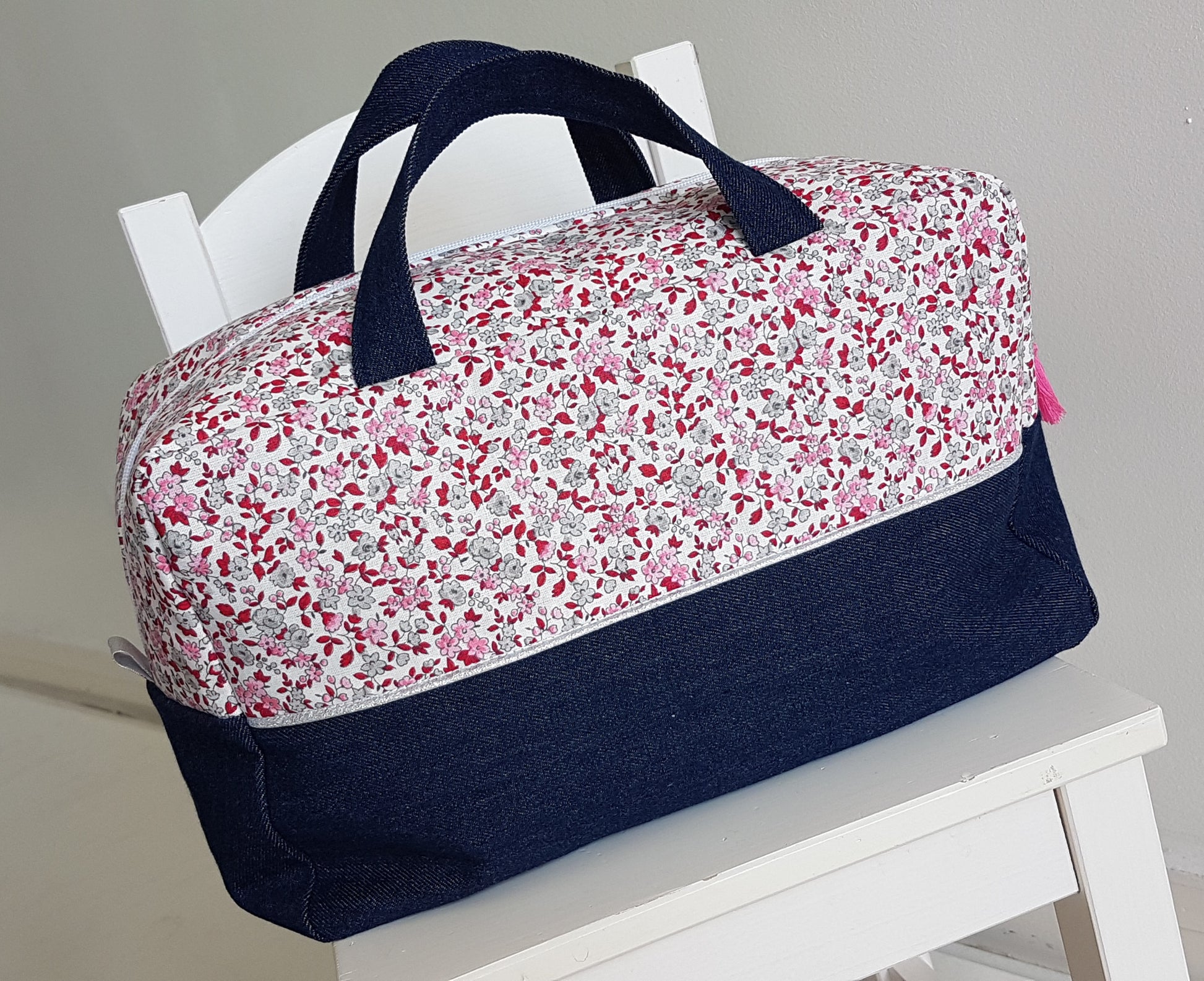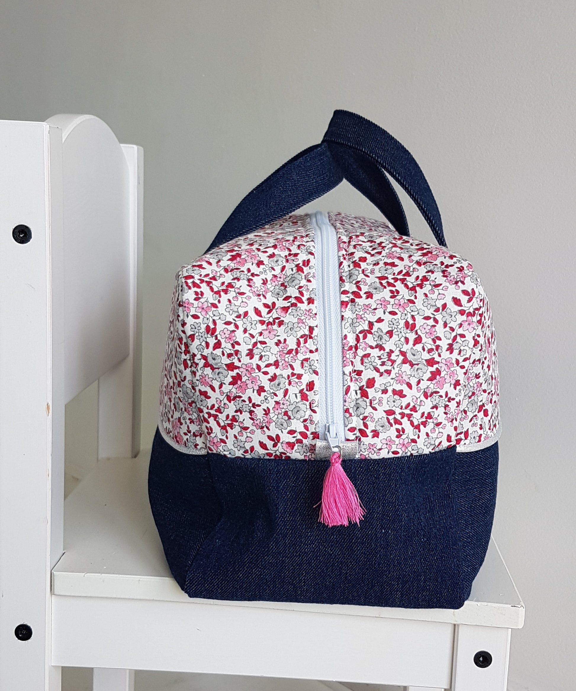 Two-tone exterior in Liberty-style floral cotton and dark blue denim jeans.