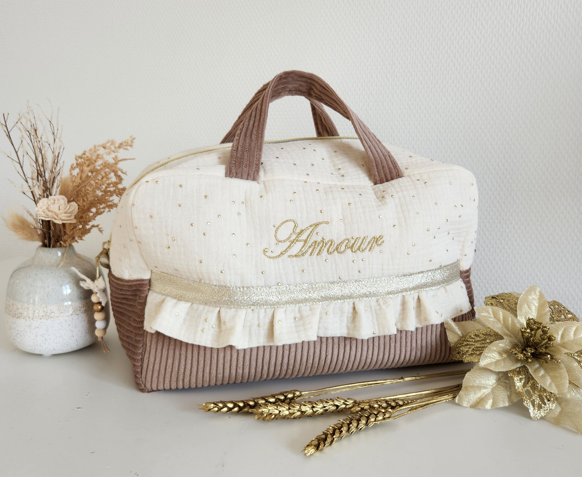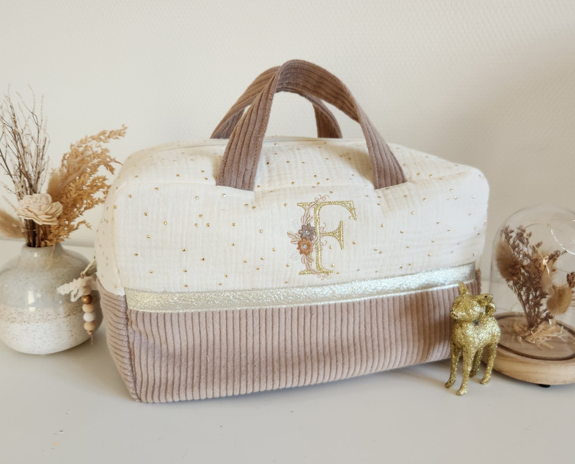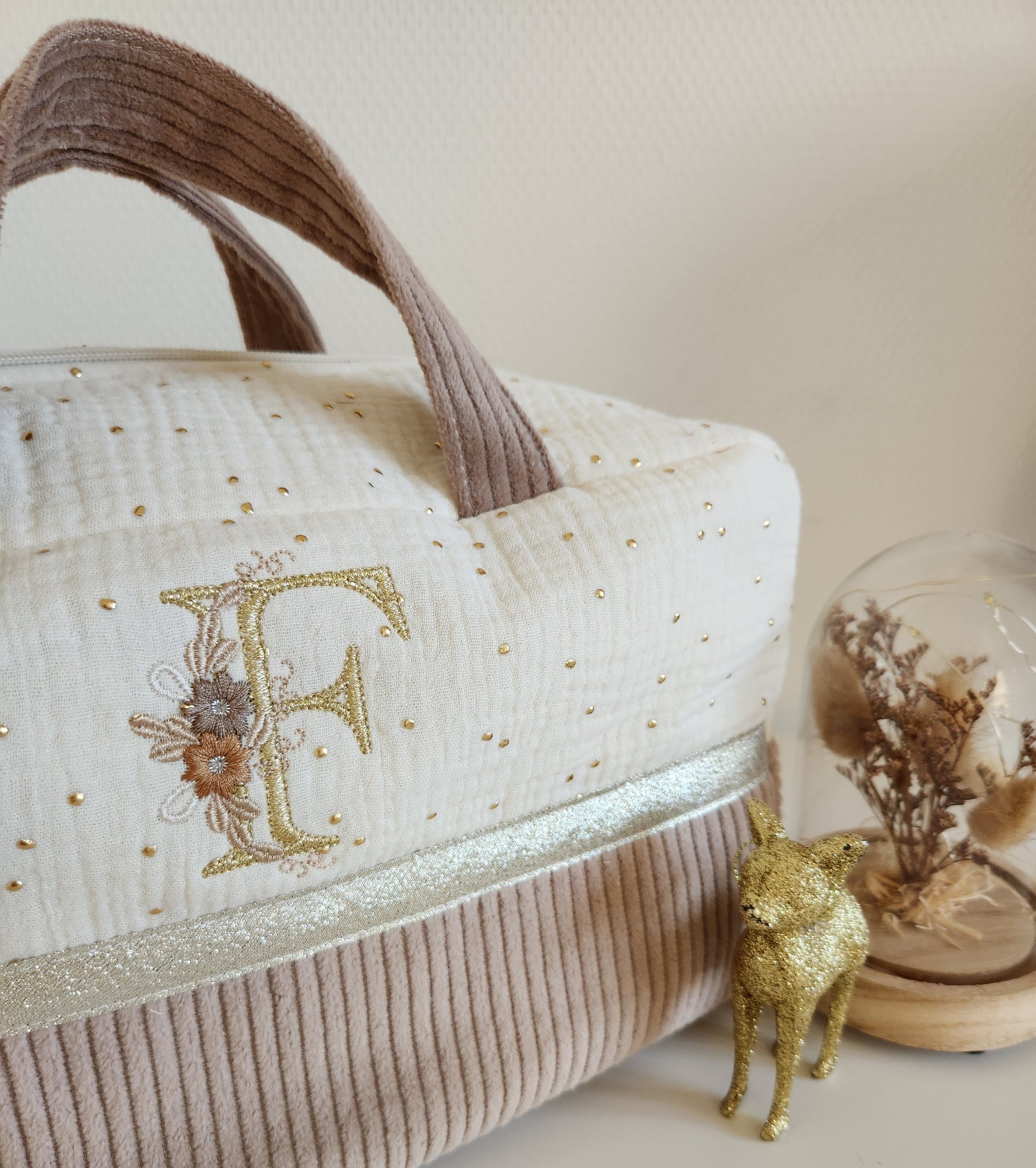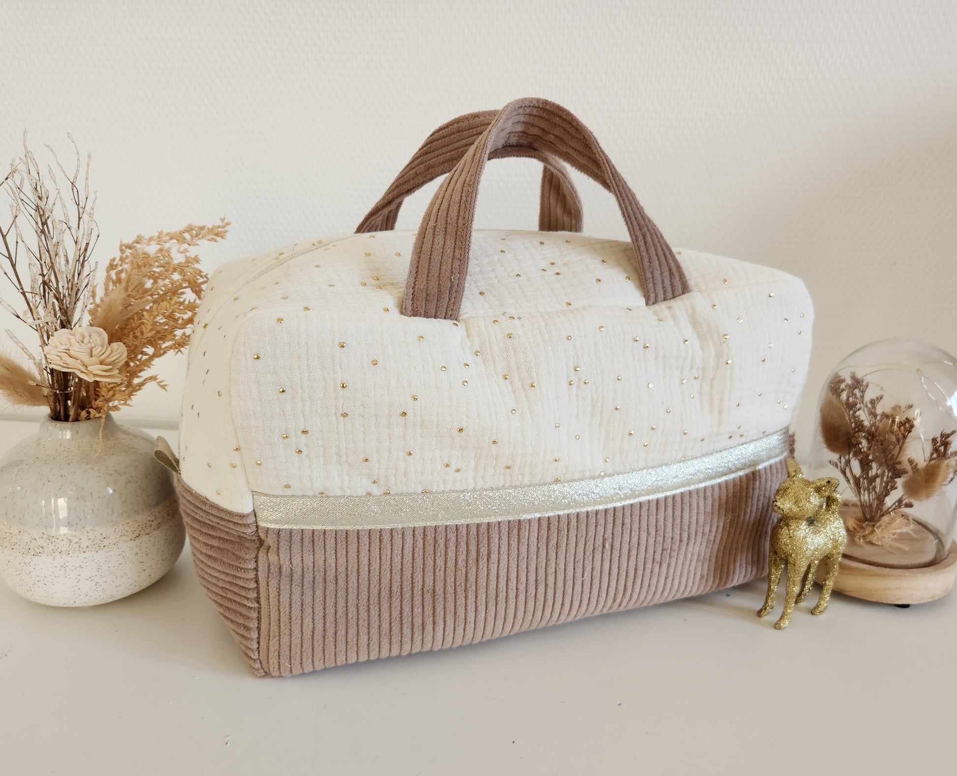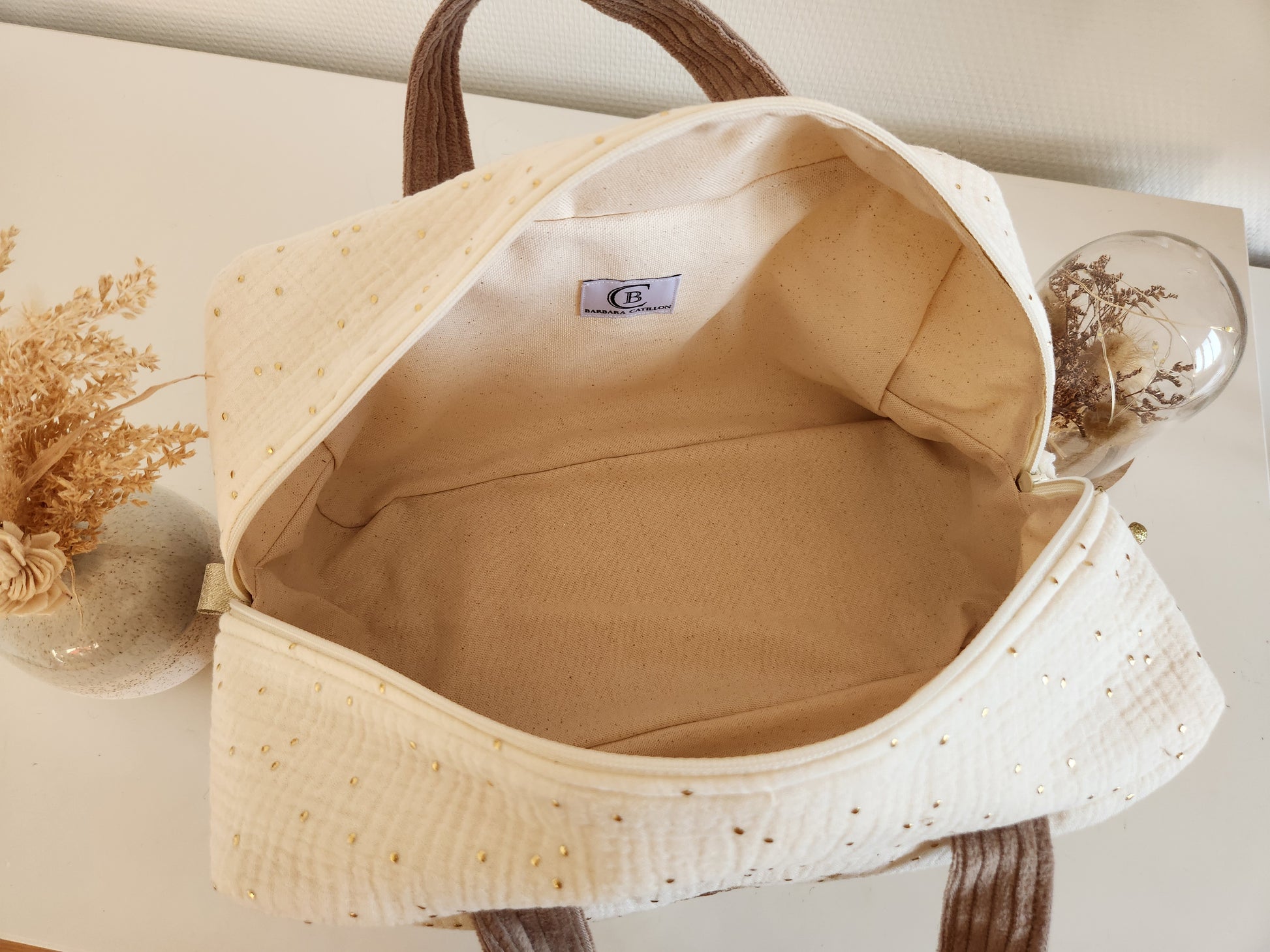 Two-tone exterior in ecru cotton gauze with gold polka dots and beige corduroy