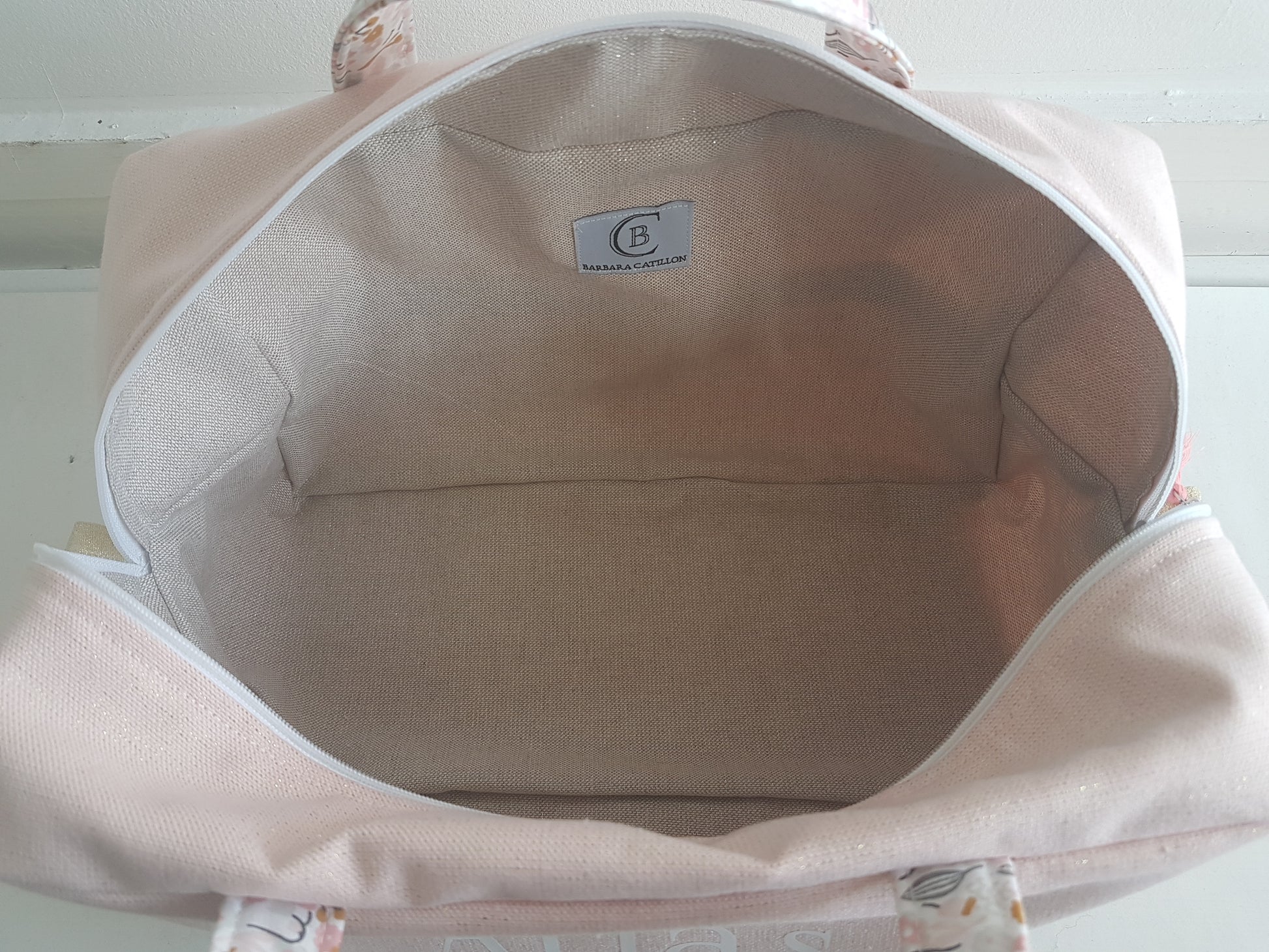 Exterior in shimmering pale pink cotton and gray, gold and pink liberty style cotton. Gold piping between the two.
